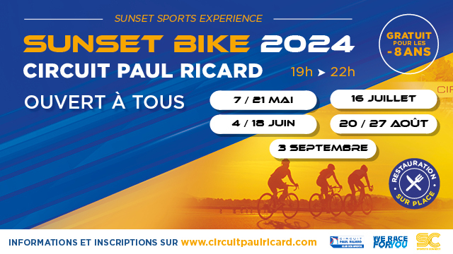 Planifiée en fin de journée, la Sunset Bike est accessible au plus grand nombre pour parfaire son entraînement ou découvrir la piste du Circuit Paul Ricard tout en admirant le coucher de soleil.